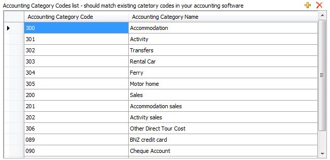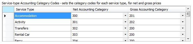 Service Types are how Travelmesh recognises what sort of services are being offered, eg. accommodation, flight, day tour. Loaded against each Service Type is a Net Accounting Category code and a Gross Accounting Category code. The difference between the two groups is that Net Accounting Category is for Purchase codes (how much the service costs), and Gross Accounting Category is for Sales codes (how much the service was sold for).