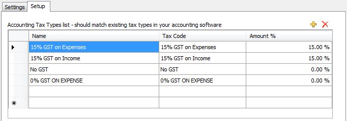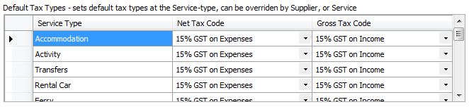 Default Tax Types can be assigned to Net and Gross sales for each Service Type. These can be overridden at the Supplier level (pre-set in the setup tab > Accounting tax type).