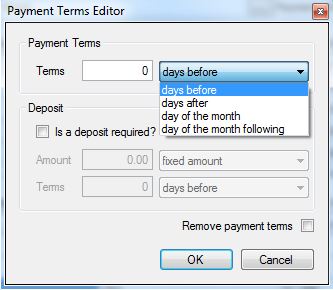 This is the standard payment term that you use to pay your Suppliers the balance (and deposit if applicable). Generally this will be the same for all agents. To input the terms, click on the Account Stoftware - ... button to see the Payment Terms Editor popup window. You will see that there are 4 payment term options available in the dropdown field.