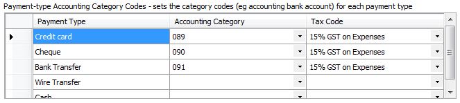 You can assign Bank account codes to the different payment types you have loaded into Tourwriter, e.g if your credit card payments always go to your cheque account, under accounting category you would enter in the accounting code for your cheque account. The example below illustrates this (ie. the accounting category code for the cheque account for this company is 089 and all credit card payments go into their cheque account).