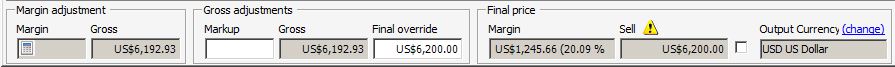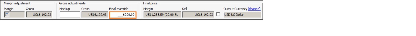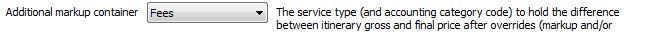 The total value of the Itinerary, based on standard commission levels, is US $6192.93. When you use the Final override field to round it up to US$620.00 (as seen above), you have created an additional profit of $7.07 for this Itinerary. The Additional markup container allows you to allocate this profit to a specific Service Type (in the Additional markup container image above the Service Type selected is Fees).