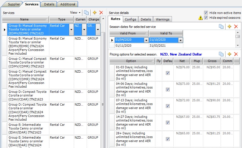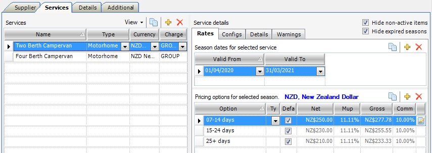 2. NZD, New Zealand Dollar appears after Pricing options for selected seasons, so that the user can easily identify that this Service is being sold in a different currency.