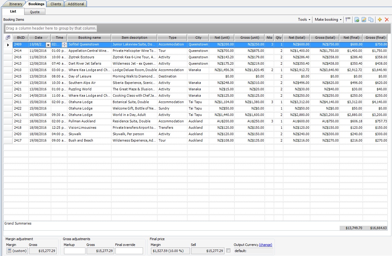 At the bottom of the Bookings List Subtab, Travelmesh will total the cost of all Bookings, and allow for adjustments to the Final Sell Price.