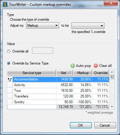 The adjustments you make in the Custom markup Overrides popup window will alter the Net amounts of the Service Types you have changed (all or selected ones) and as such your Net (final) price.