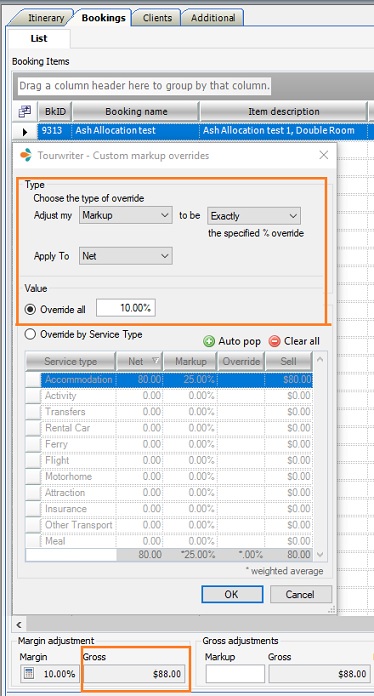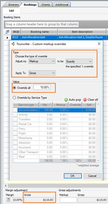 Click the calculator icon under the Margin adjustment section at the bottom of the Bookings tab to open the Custom markup overrides box. The Adjust my section on the box lets you select the override type. You can override the Markup, Commission or the Agent Commission using the Override all field or you can Override by Service Type.