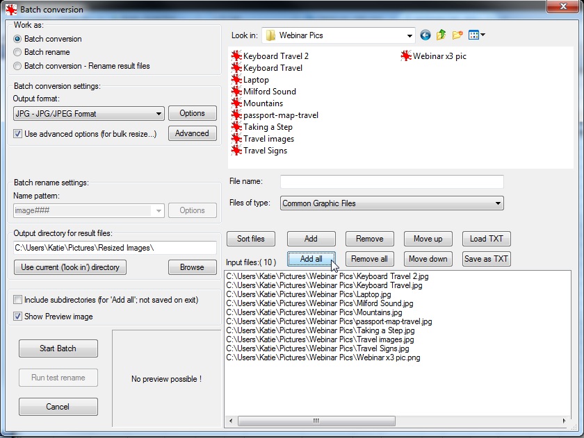 - In the Batch Conversion Window ‘Add’ the images you would like to resize or ‘Add all’. Images selected will appear as a list in the bottom window