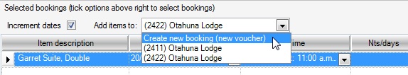 To unlink Bookings and ensure they have their own separate Booking ID’s as you are adding them to your Itinerary: in the Add new booking window, either tick the Auto-assign New BkID box or alternatively go to Add items to and select Create new booking (new voucher) from the drop down options offered.