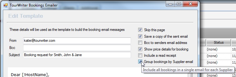 Splitting bookings changes the way your Booking emails are sent to Suppliers. To ensure all bookings with the same Suppliers are sent on the same email, ensure you tick the ‘Group bookings by Supplier email’ in the Edit Template window (as shown below), when you make a booking via the Make booking button on the Bookings List Subtab.