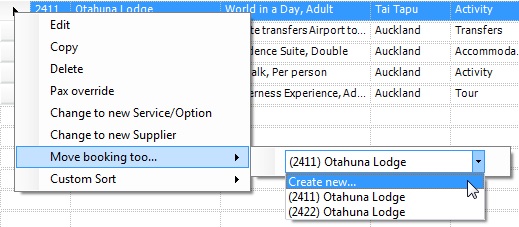 To unlink Bookings once the Bookings are in the Bookings Items List Subtab of the Itinerary, select the Booking you wish to unlink and right click the Booking item line and select ‘Move booking to…’Click on the drop-down arrow and select, ‘Create new…’. The Booking ID will now have a BkID of -1. Click Save (or (CTRL S) to see your new BkID.