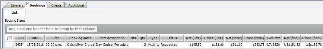 In the below example, a Day Cruise has been added to the Itinerary Bookings List.