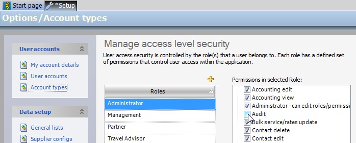 Firstly, permission must be set up in order for each User Role to gain access to the Audit Trail area. To do this go to Tools > Setup > Account types and select (tick) Audit in the Permissions in selected Role box.