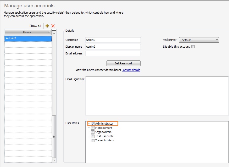 7. Travelmesh highly recommends that there be at least two users with full administration rights to the database, in case one of them is on a leave or is absent. So to add the second user to be assigned the Administrator role. Go to Tools > Setup > User accounts.