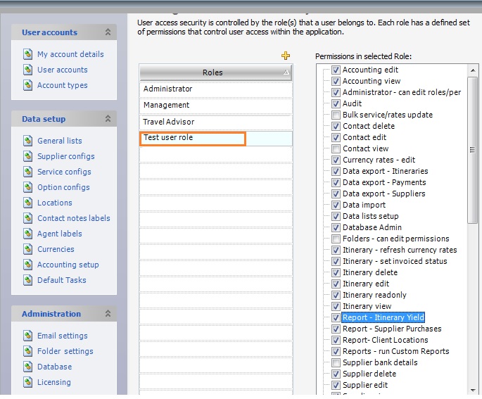 4. The existing roles, such as the Travel Advisor role can be restricted to fewer permissions. For example, Travel Advisors may only be given permission to add, delete or edit contacts and itineraries and additionally run reports.